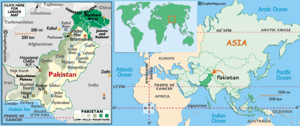 Pakistan is een land in Zuid-Azië, dat ligt op het Indische subcontinent, grenzend aan India, Afghanistan, Iran, China en aan de Arabische Zee. De hoofdstad is Islamabad. Pakistan maakte oorspronkelijk samen met India en Bangladesh deel uit van Brits-India. Pakistan betekent Land der reinen, waarmee moslims worden bedoeld. Ook hebben de letters van Pakistan een betekenis. De P is van Punjab, de A van Afghanistan, de K van Kasjmir, de S van Sindh en Tan van Baluchistan. Deze letters vormen Pakstan. Hier is door de Engelsen een i tussengevoegd zodat de uitspraak wat makkelijker werd.