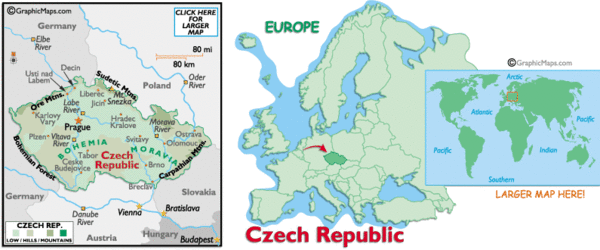 Tsjechië is gelegen in Centraal-Europa. Het is het westelijke deel van het voormalige Tsjechoslowakije. Tsjechië grenst in het westen en noordwesten aan Duitsland, in het noorden aan Polen, in het oosten aan Slowakije en in het zuiden aan Oostenrijk. In de Middeleeuwen maakten de twee belangrijkste delen van Tsjechië, Bohemen en Moravië, deel uit van het Heilige Roomse Rijk der Duitse Natie. Het koninkrijk Bohemen was een belangrijke macht, maar religieuze conflicten zoals de Hussietenoorlogen in de 15e en de Dertigjarige oorlog in de 17e eeuw scheurden het rijk uiteen. Later kwam het gebied in de macht van de Habsburgers en maakte deel uit van het grote Oostenrijk-Hongarije. Nadat de Eerste Wereldoorlog een eind had gemaakt aan het bestaan van Oostenrijk-Hongarije, sloten de Tsjechen en het naastgelegen Slowakije zich aaneen, en richtten in 1918 de onafhankelijke republiek Tsjechoslowakije op.
