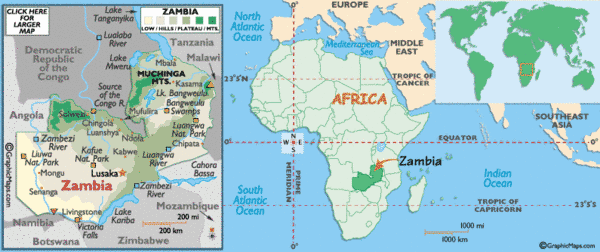 Zambia grenst aan Congo-Kinshasa, Tanzania, Malawi, Mozambique, Zimbabwe, Botswana, Namibië en Angola. Zambia is een onafhankelijke republiek met als belangrijkste economische factor de mijnindustrie (koper). Er zijn bewijzen gevonden dat Zambia al 300.000 jaar geleden werd bewoond door mensachtige. Waarschijnlijk waren Pygmeevolken de eerste bewoners van Zambia. In de 18de en 19e eeuw floreerde er een slavenhandel in Zambia. Deze slavenhandel bezorgde de bevolking veel leed. In 1895 werd Zambia 'eigendom' van de British South-Africa Company (BSA). In 1924 werd Zambia een Britse kroonkolonie onder de naam Noord-Rhodesië.